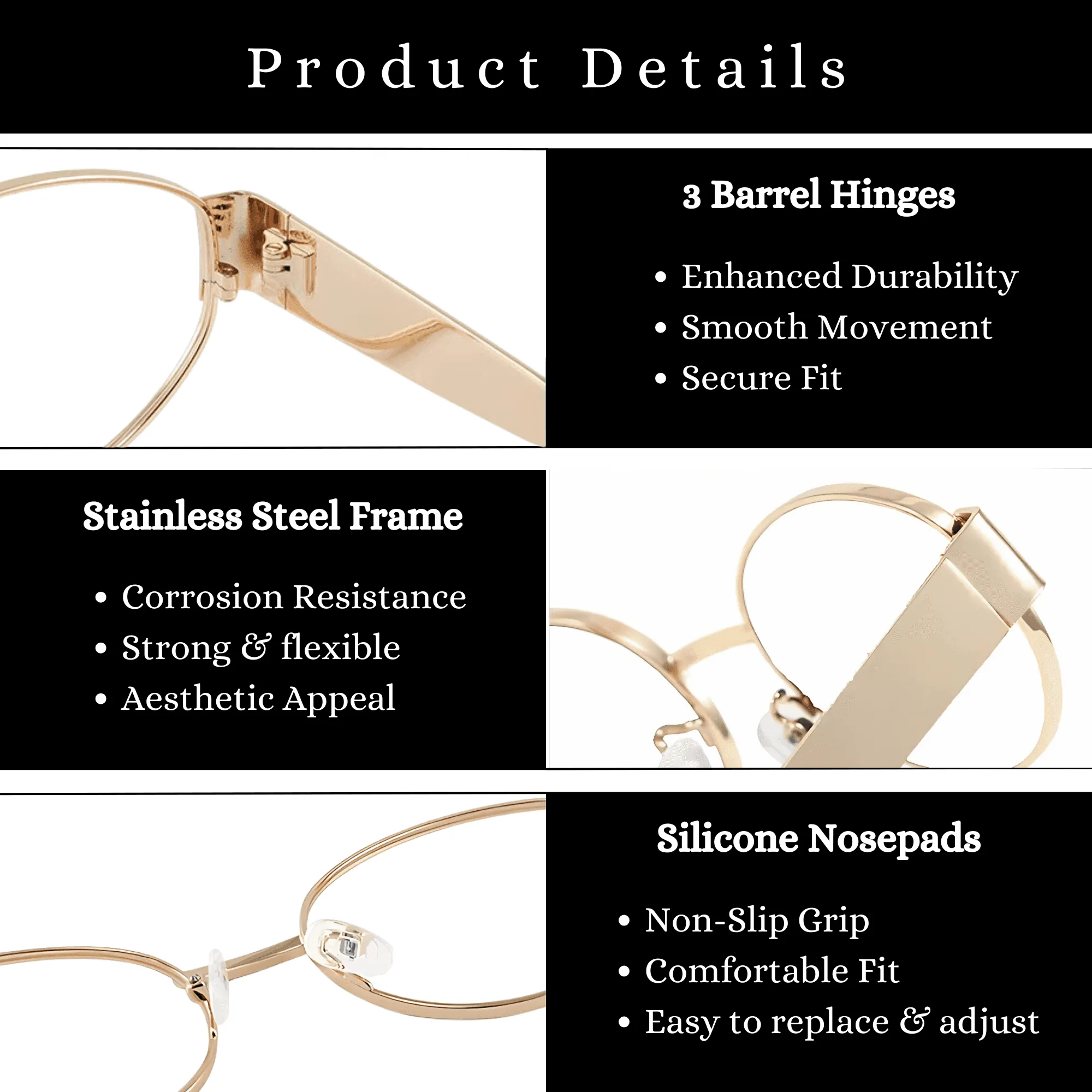 The essntl Series Retro Oval Blue Light Blocking Computer Glasses combine timeless style with modern functionality, making them the perfect choice for both work and play. Designed to protect your eyes during long hours of screen time, these glasses feature advanced blue light blocking technology to reduce eye strain and fatigue, along with premium anti-glare lenses for crystal-clear vision in any lighting. With UV400 protection, your eyes are also shielded from harmful UVA and UVB rays, whether you're indoors or outdoors. Crafted with 3-barrel metal hinges for durability, silicone nosepads for all-day comfort, and chic leopard print temple tips for a bold touch, these glasses are as comfortable as they are stylish. Available in four stunning colors—Havana Leopard, Aurora Gold, Platinum Silver, and Onyx Black—the essntl Series is the perfect blend of elegance, practicality, and personality.