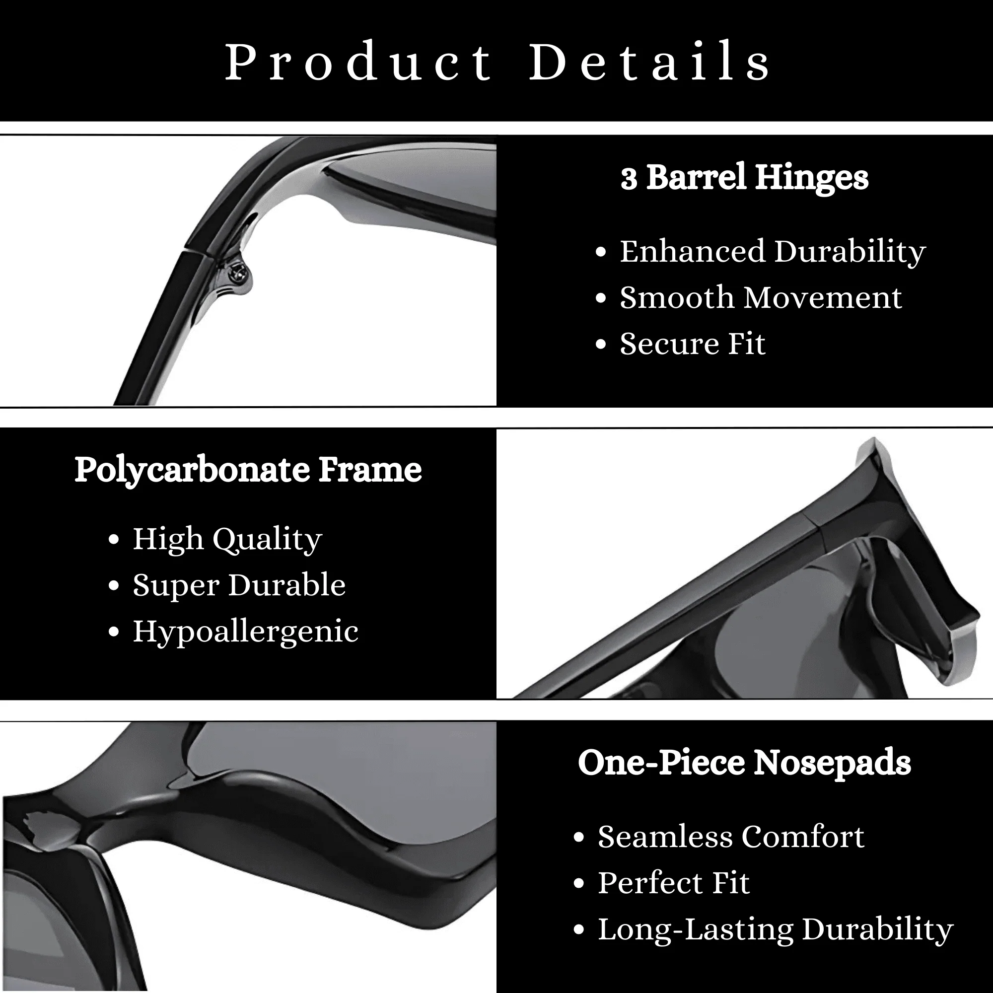 The Futuristic Series Bat Y2K Sunglasses redefine bold, edgy eyewear with their sleek, wraparound design. Designed for both men and women, these sunglasses feature a striking angular frame that exudes a futuristic, cyberpunk-inspired aesthetic. Crafted from high-quality polycarbonate (PC), the frame is lightweight yet impact-resistant, ensuring durability and long-lasting wear. The 3-barrel metal hinges provide smooth flexibility and strength, while the integrated nose pads offer a secure and comfortable fit for all-day use. The dark, high-coverage lenses enhance the mystique and sport-luxe appeal, making these sunglasses perfect for those who love to stand out with confidence. Whether you're making a bold streetwear statement or embracing the Y2K revival, the Bat Y2K Sunglasses are the perfect fusion of style, attitude, and functionality.