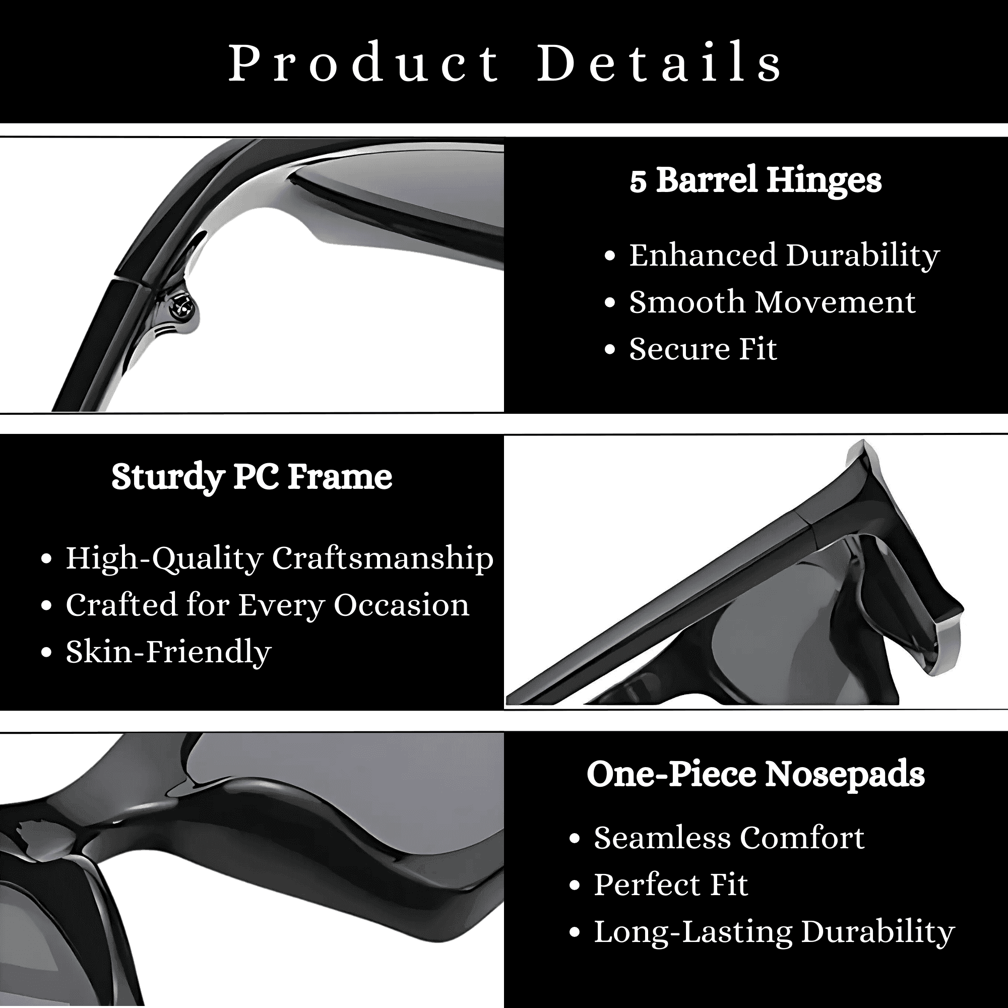 The Futuristic Series Bat Y2K Sunglasses redefine bold, edgy eyewear with their sleek, wraparound design. Designed for both men and women, these sunglasses feature a striking angular frame that exudes a futuristic, cyberpunk-inspired aesthetic. Crafted from high-quality polycarbonate (PC), the frame is lightweight yet impact-resistant, ensuring durability and long-lasting wear. The 3-barrel metal hinges provide smooth flexibility and strength, while the integrated nose pads offer a secure and comfortable fit for all-day use. The dark, high-coverage lenses enhance the mystique and sport-luxe appeal, making these sunglasses perfect for those who love to stand out with confidence. Whether you're making a bold streetwear statement or embracing the Y2K revival, the Bat Y2K Sunglasses are the perfect fusion of style, attitude, and functionality.